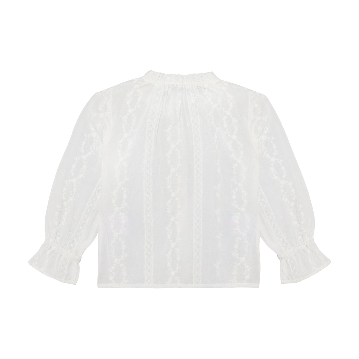 Prachtig blousje met geborduurde bloemetjes en ruffels aan de mouwen.