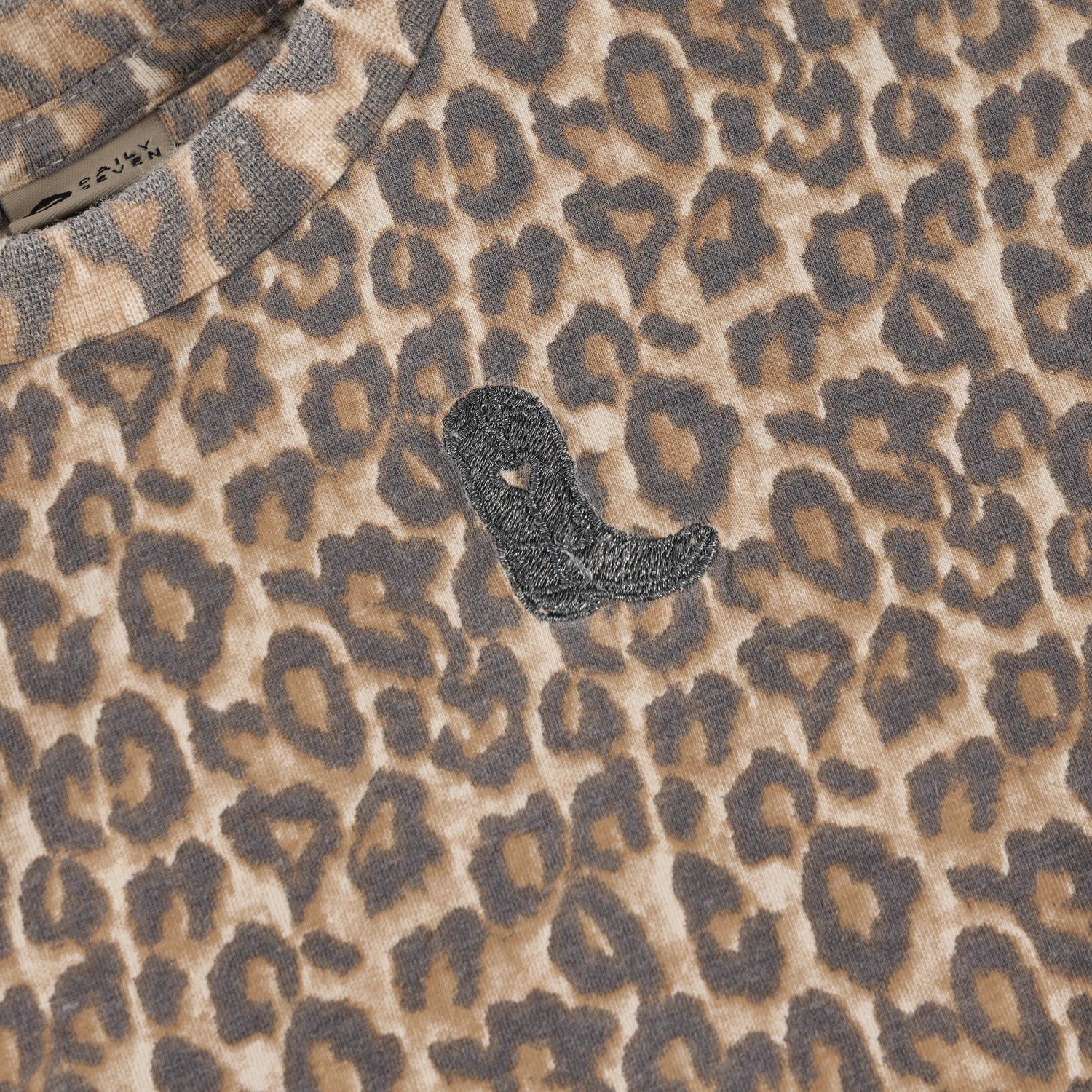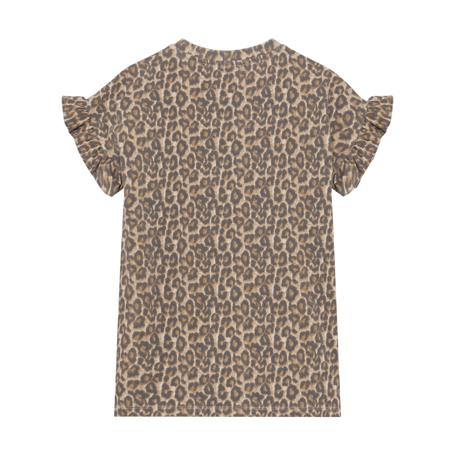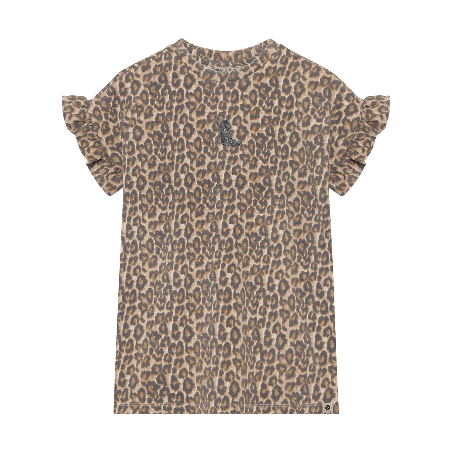 Fantastisch t-shirt jurkje met panter print! De jurk heeft ruffels aan de mouwuiteinden en een stoer borduursel op de borst van een cowboylaars.