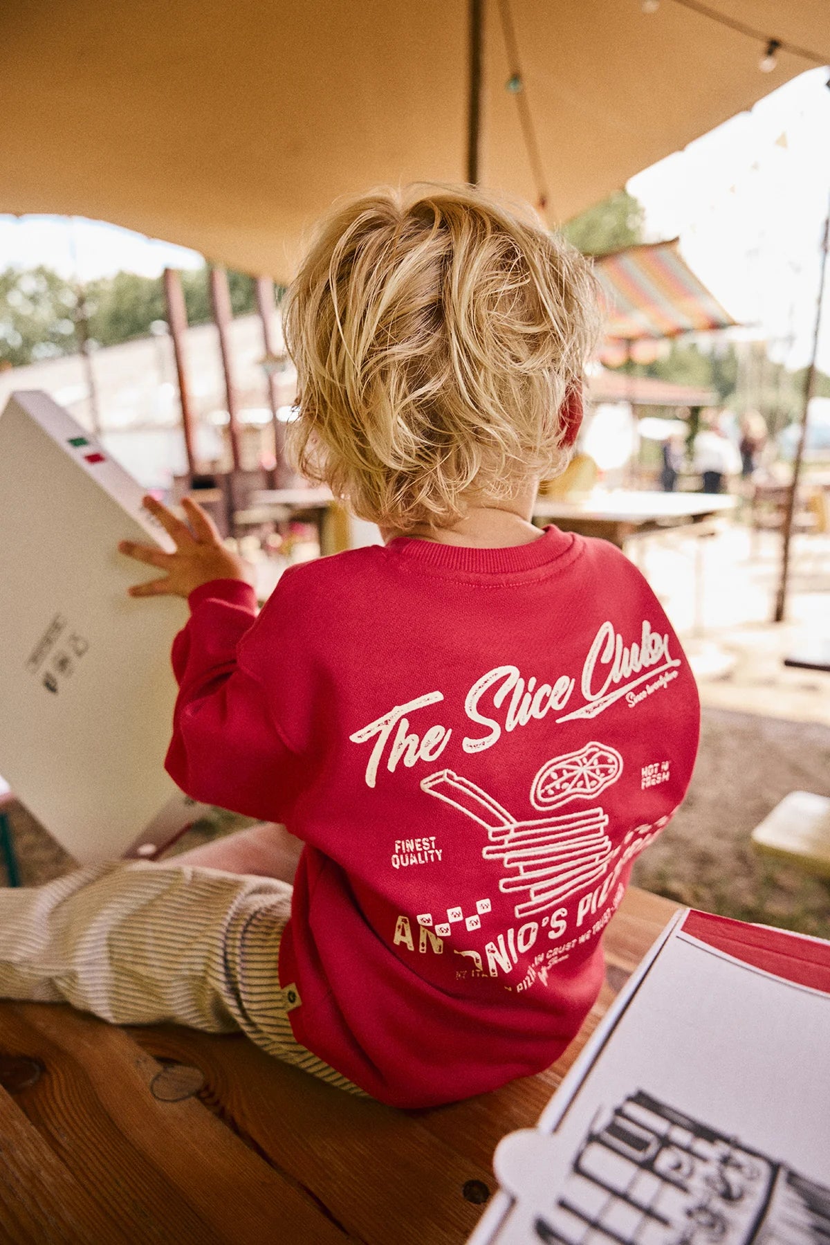The Slice Club sweater in de kleur ‘Chrysanthemum’ heeft speelse print op de voor- en achterkant.