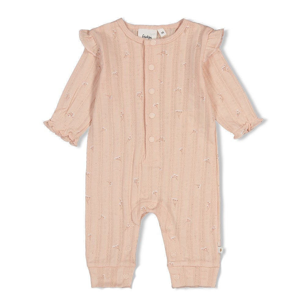 Schattig boxpakje met bloemetjes en pointelle van Feetje. Het pakje heeft drukknoppen onder de beentjes en aan de voorkant op de borst.