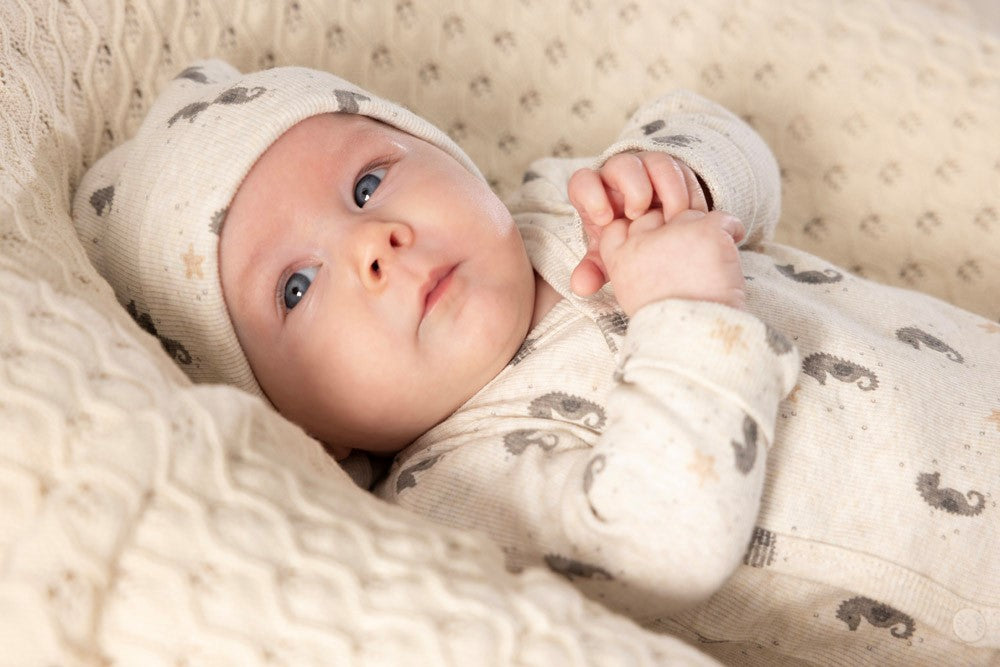 Schattige overslag romper met lange mouwen van Feetje. Het rompertje heeft een all over zeepaardjes print.