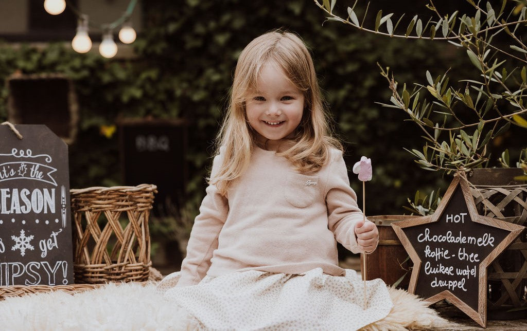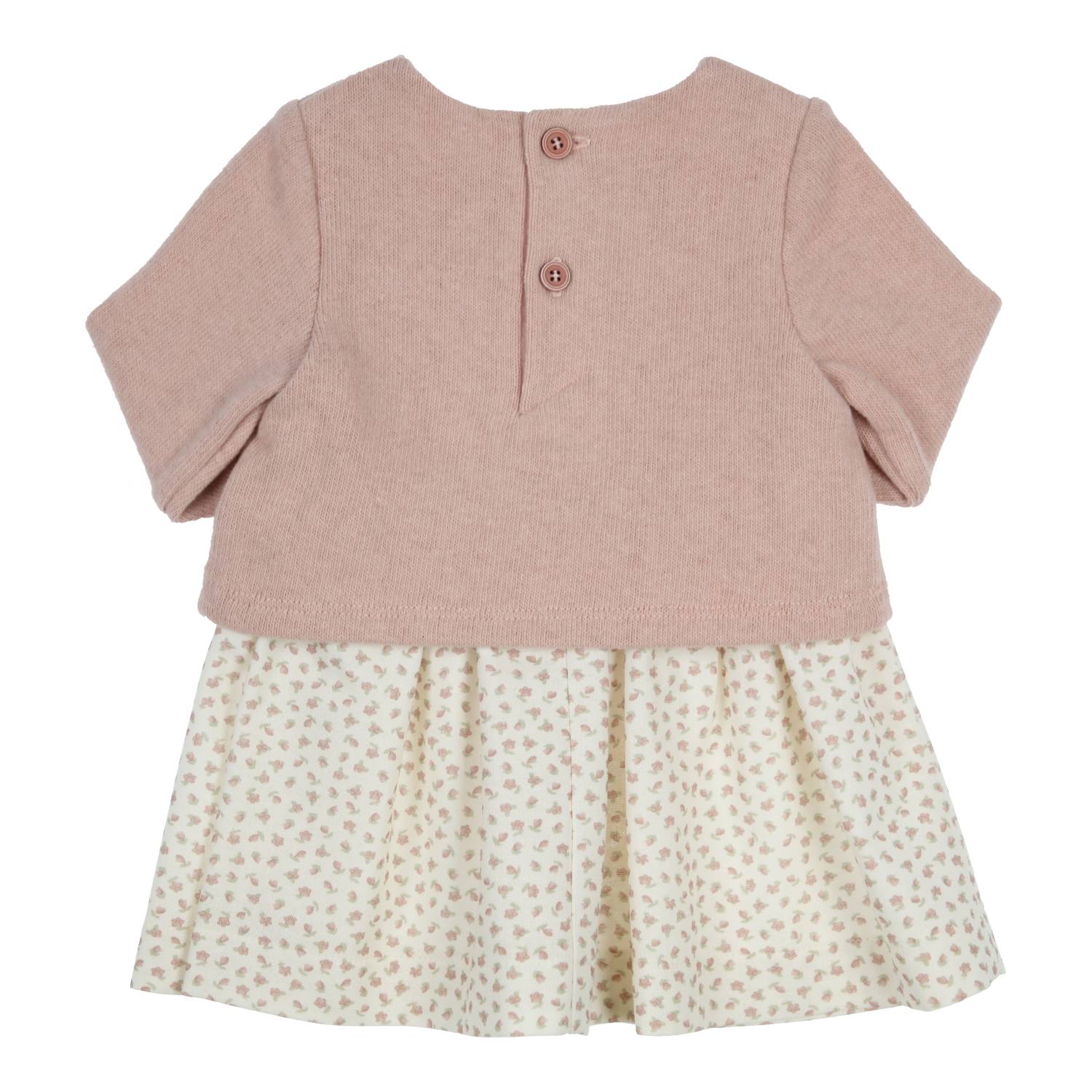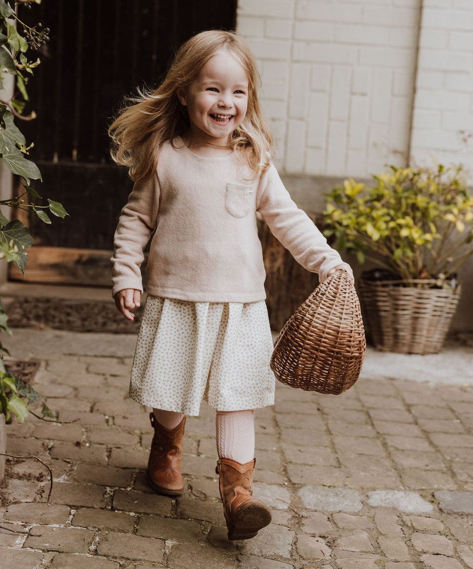 Een jurkje dat eruitziet als een setje, hoe handig is dat? Gebreid topje in oudroze met een bloemetjesrokje, ideaal voor dagelijks gebruik met nét dat tikkeltje meer. Gemaakt uit geruwd katoen, dat zacht en licht ruw aanvoelt voor een cozy wintergevoel.