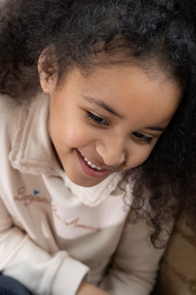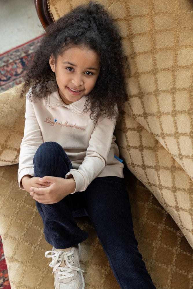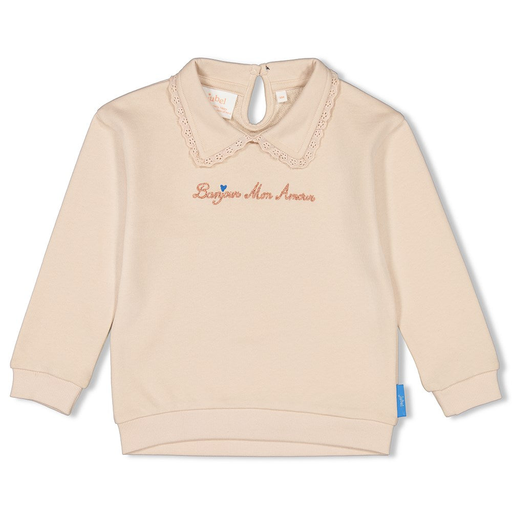 Rekbare katoenen sweater met kraagje van Jubel. Leuk detail is de geborduurde tekst op de voorkant: ‘Bonjour mon amour’ en het broderie randje langs de kraag.
