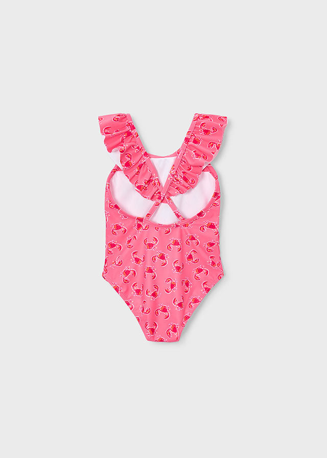Vrolijk badpak met krabben print van Mayoral. Schattig detail is het ruffle randje op de hals.