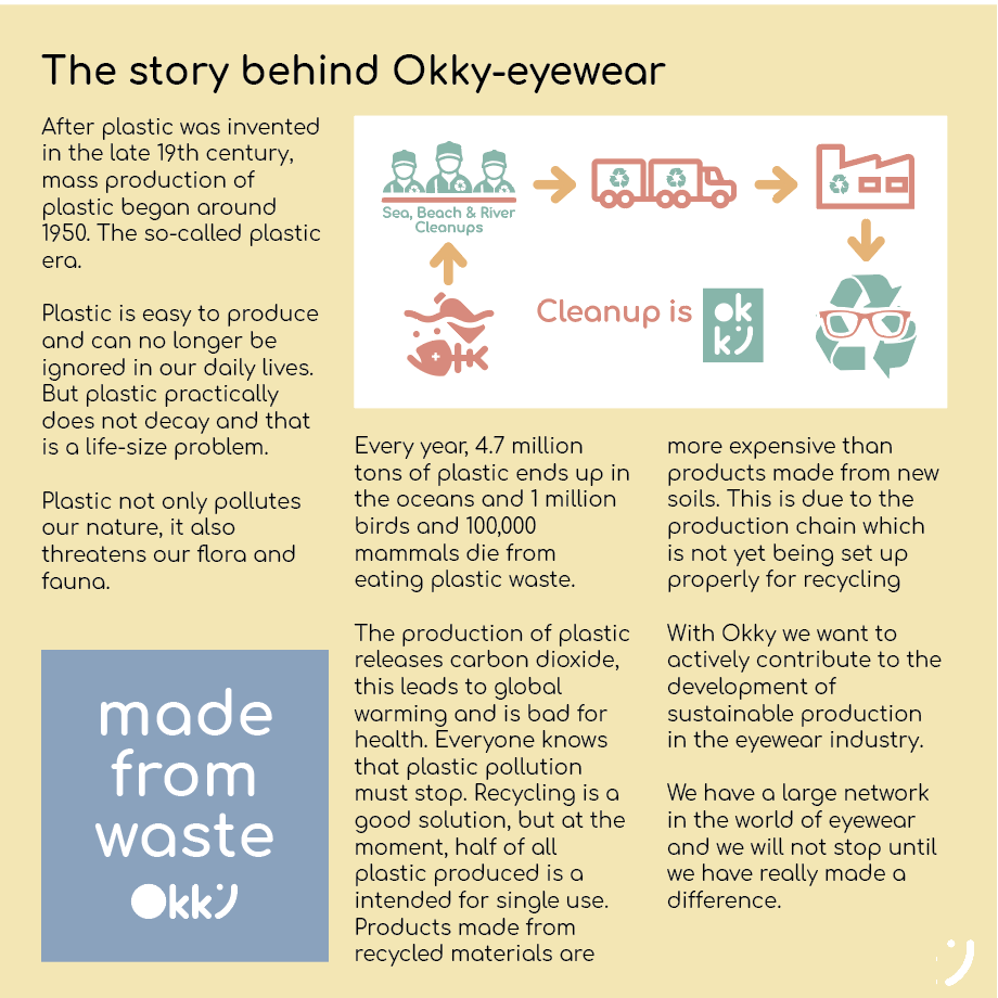 De Okky zonnebril is gemaakt van recycled plastic. In samenwerking met WFO (Waste Free Ocean) draagt Okky zo zijn steentje bij om de oceanen, rivieren en stranden weer wat schoner te maken. Met de aankoop van een Okky zonnebril worden deze dus ook daadwerkelijk schoner!