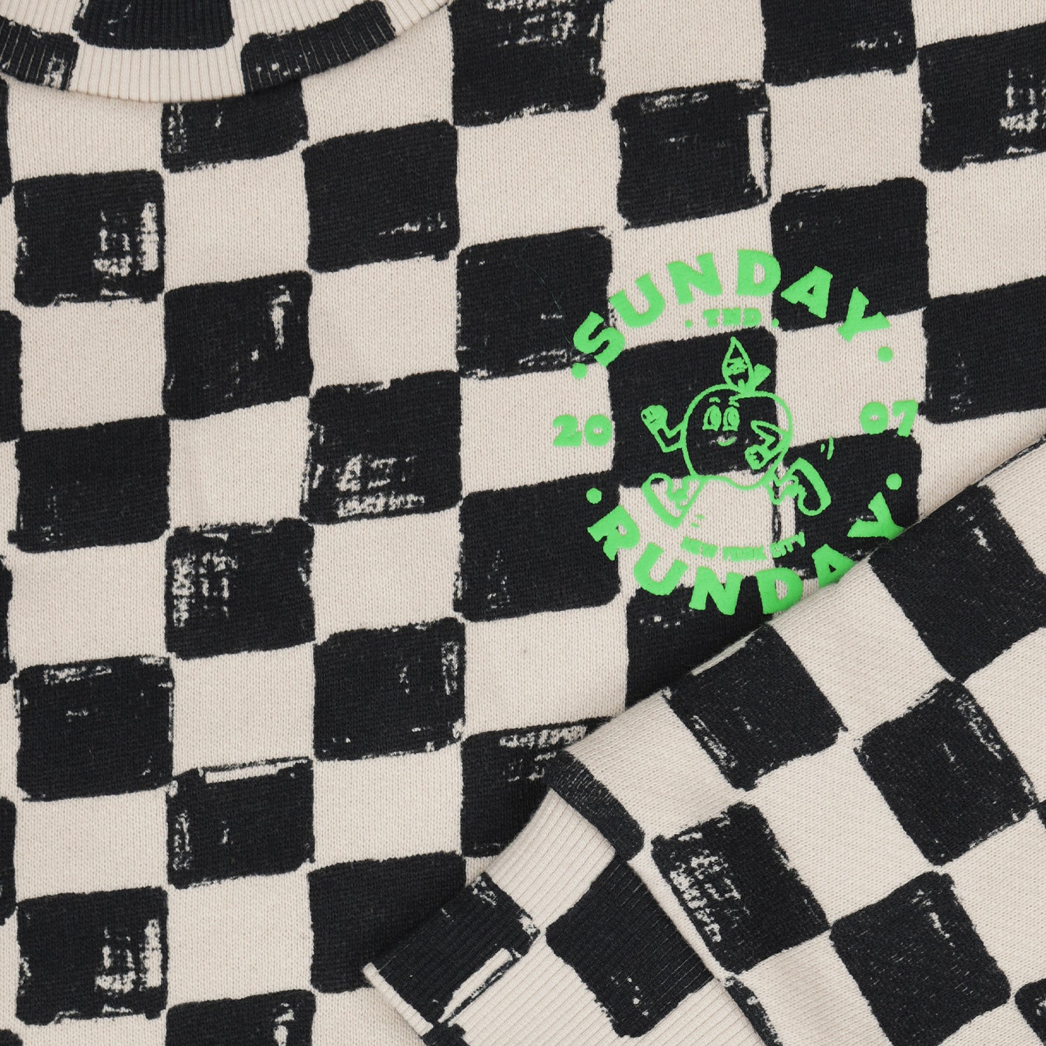 Deze zachte, oversized blauw witte sweater is voorzien van een all over checkerboard print en heeft stoere ribboorden.