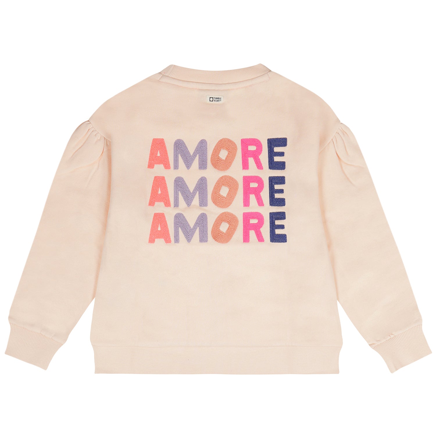 Deze zachte en comfortabele sweater voor meisjes is een stijlvolle keuze voor elke dag. De sweater is uitgevoerd in een licht perzikachtige kleur, met een speels geborduurd hartje op de borst en de tekst 'Amore, Amore, Amore' geborduurd op de achterkant.