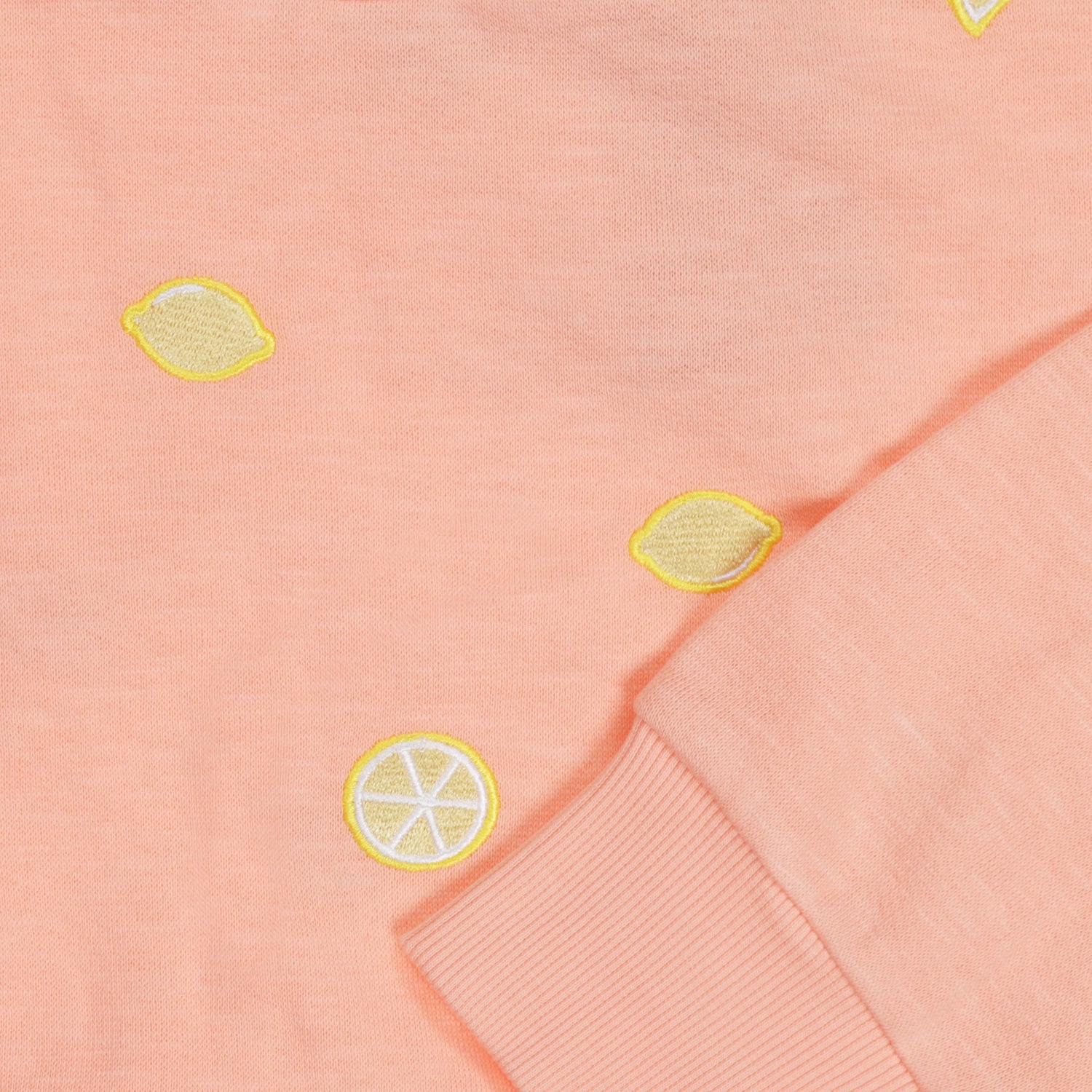 Deze perzikkleurige sweater heeft een oversized fit, raglan mouwen, stoere ribboorden en een all over borduur van citroenen.