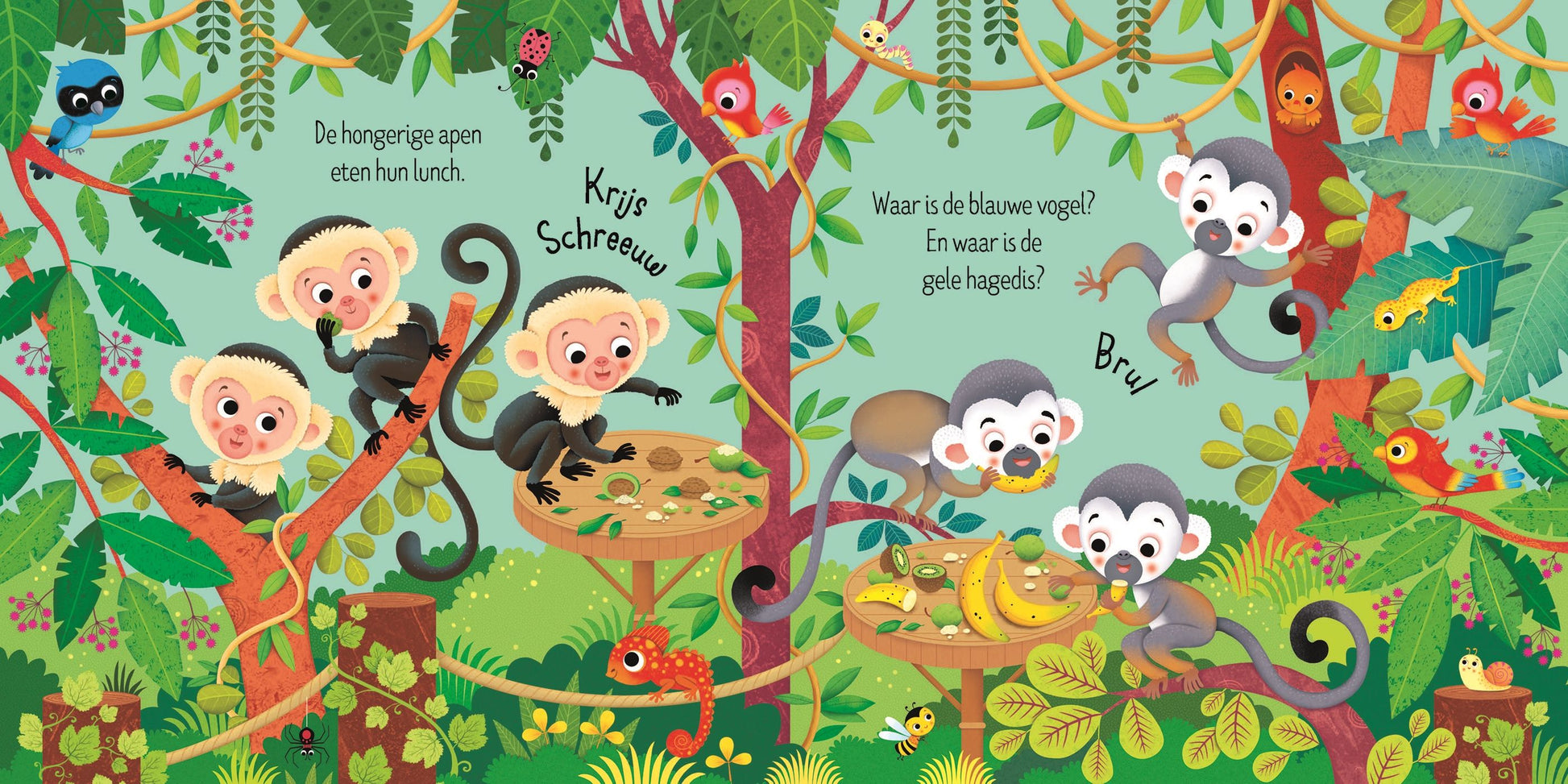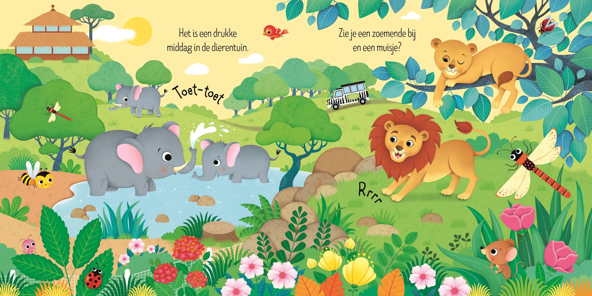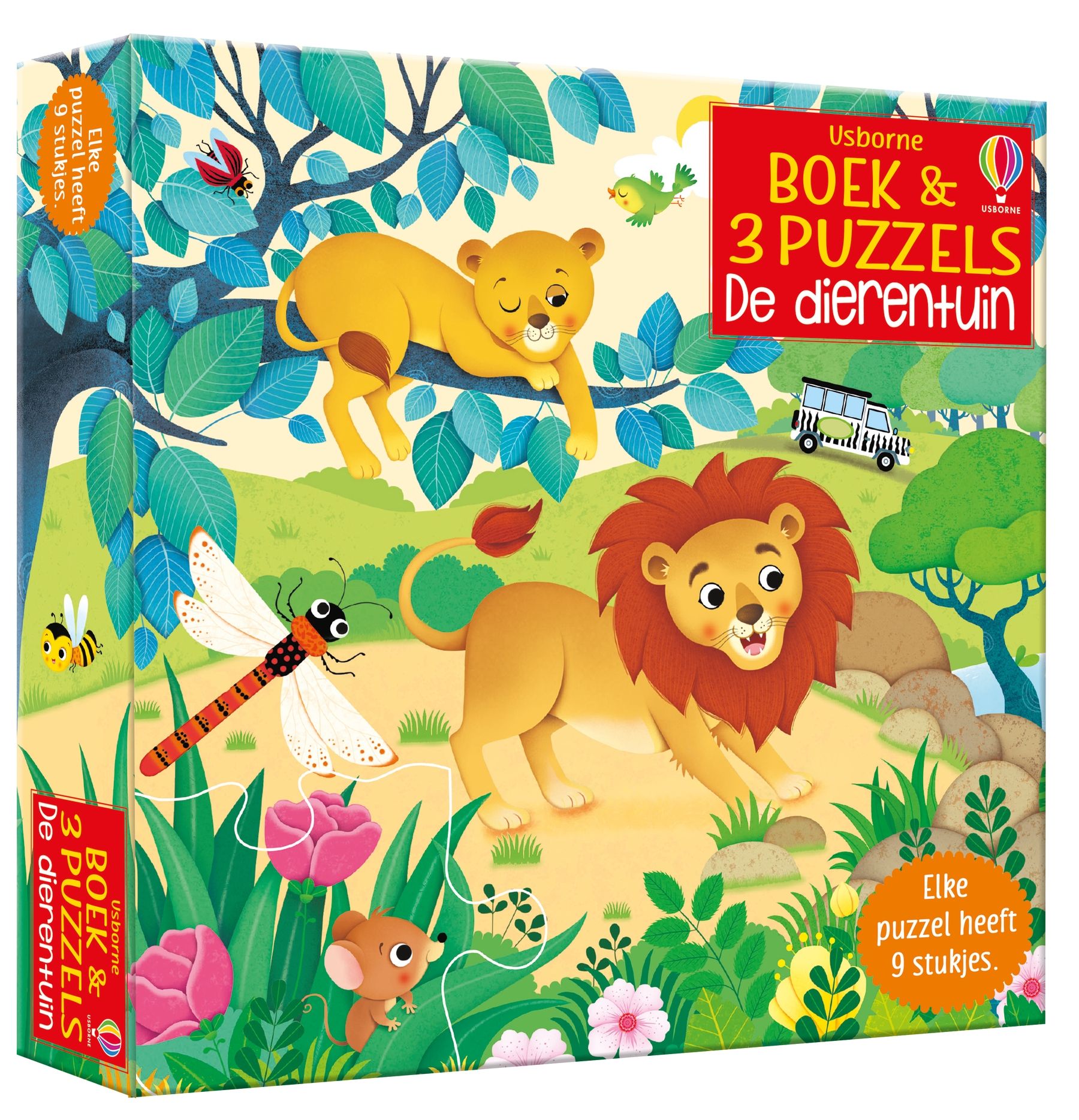 Drie puzzels van 9 stukjes met afbeeldingen van een drukke dierentuin, samen met een kartonboekje in een stevige doos. Zowel het boekje als de puzzels staan vol met dieren en dingen om te ontdekken en samen over te praten.